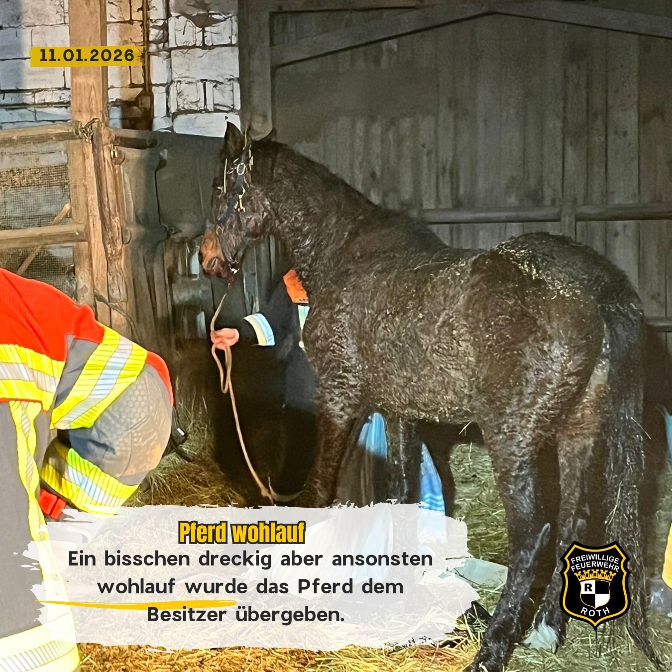 Ein Pferd rutschte in Heideck in einem Hof auf einer Eisfläche aus und konnte alleine nicht mehr aufstehen. Die Feuerwehr ist gefragt – und auch unser Rüstwagen wurde alarmiert, schließlich haben wir ein spezielles Großtierrettungsgeschirr.