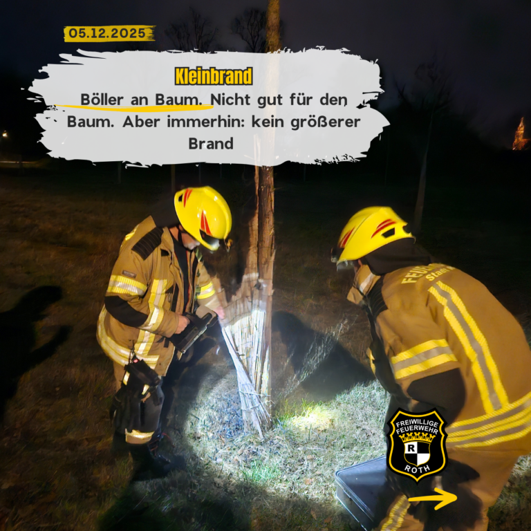 Während die Abnahme der Kinderflamme noch im Gang war, wurden wir zu einem Kleinbrand alarmiert. Ein Böller wurde in die Ummantelung eines Baums geworfen (Stichwort: da brennt der Baum 🙃 ) – diese war leicht angekokelt. Die Kontrolle mit der Wärmebildkamera zeigte: die Schuhe des Angriffstrupps sind wärmer als der Baum – also kein Einsatz erforderlich.