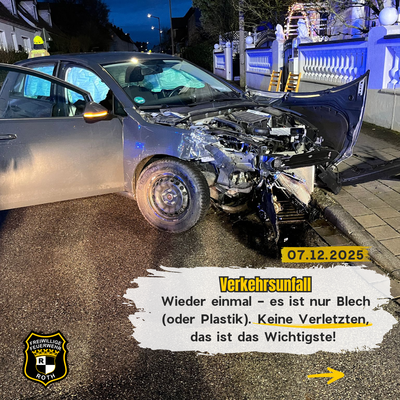 Zum Abschluss der Woche mussten unsere Kräfte leider nochmal ausrücken, am Sonntag, 7.12.2025 kam es zu einem Verkehrsunfall – glücklicherweise wieder keine Verletzten. Wir betreuten die Betroffenen bis zum Eintreffen des Rettungsdiensts und kehrten anschließend auslaufende Betriebsmittel ab. Natürlich befreiten wir auch hier die Straße von den herumliegenden Trümmerteilen.