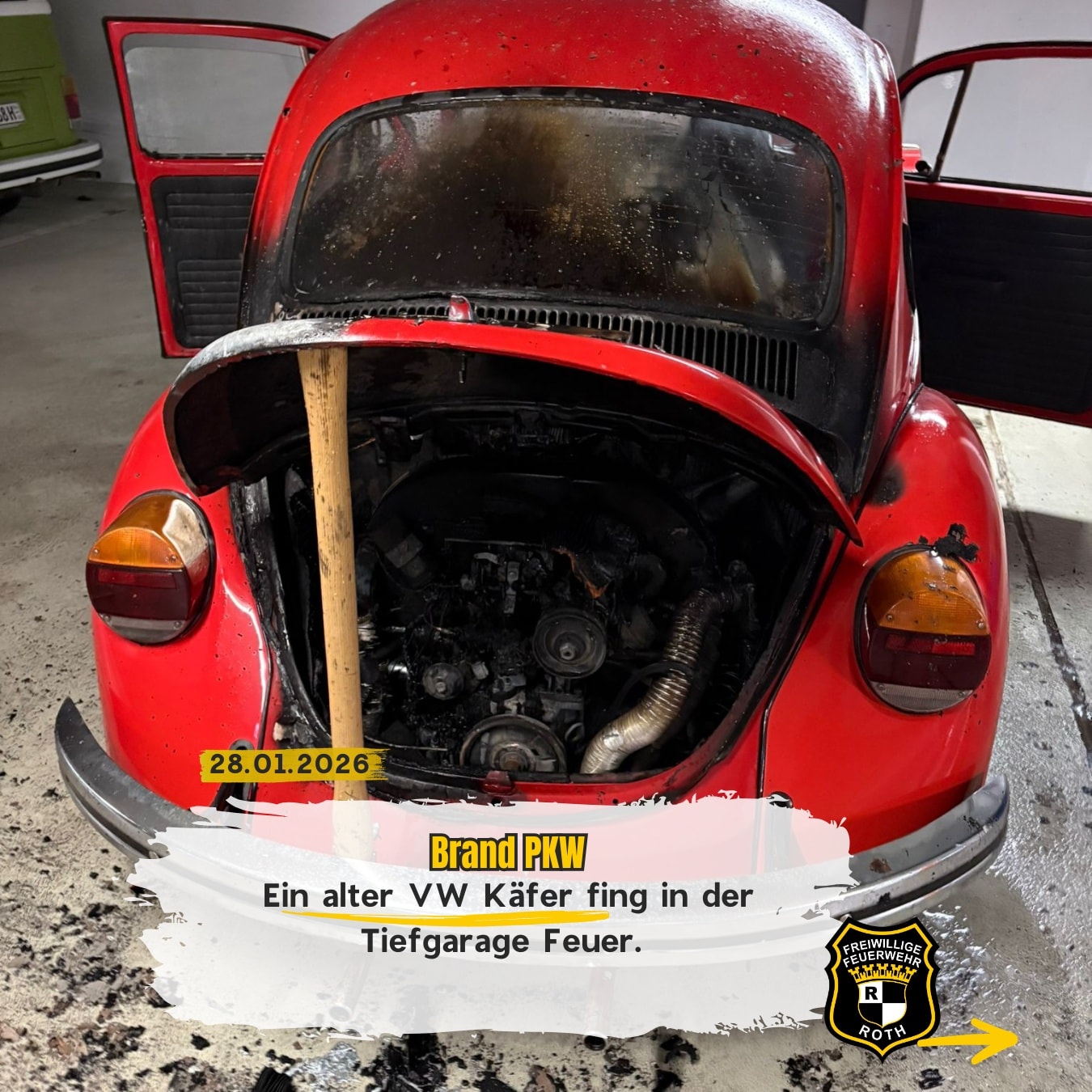 In einer Tiefgarage brannte der Motorraum eines alten VW Käfer. Besitzer und Hausmeister konnten die Flammen bereits eindämmen so dass für unsere Einsatzkräfte nur noch Nachlöscharbeiten sowie die Belüftung der Tiefgarage anstanden.